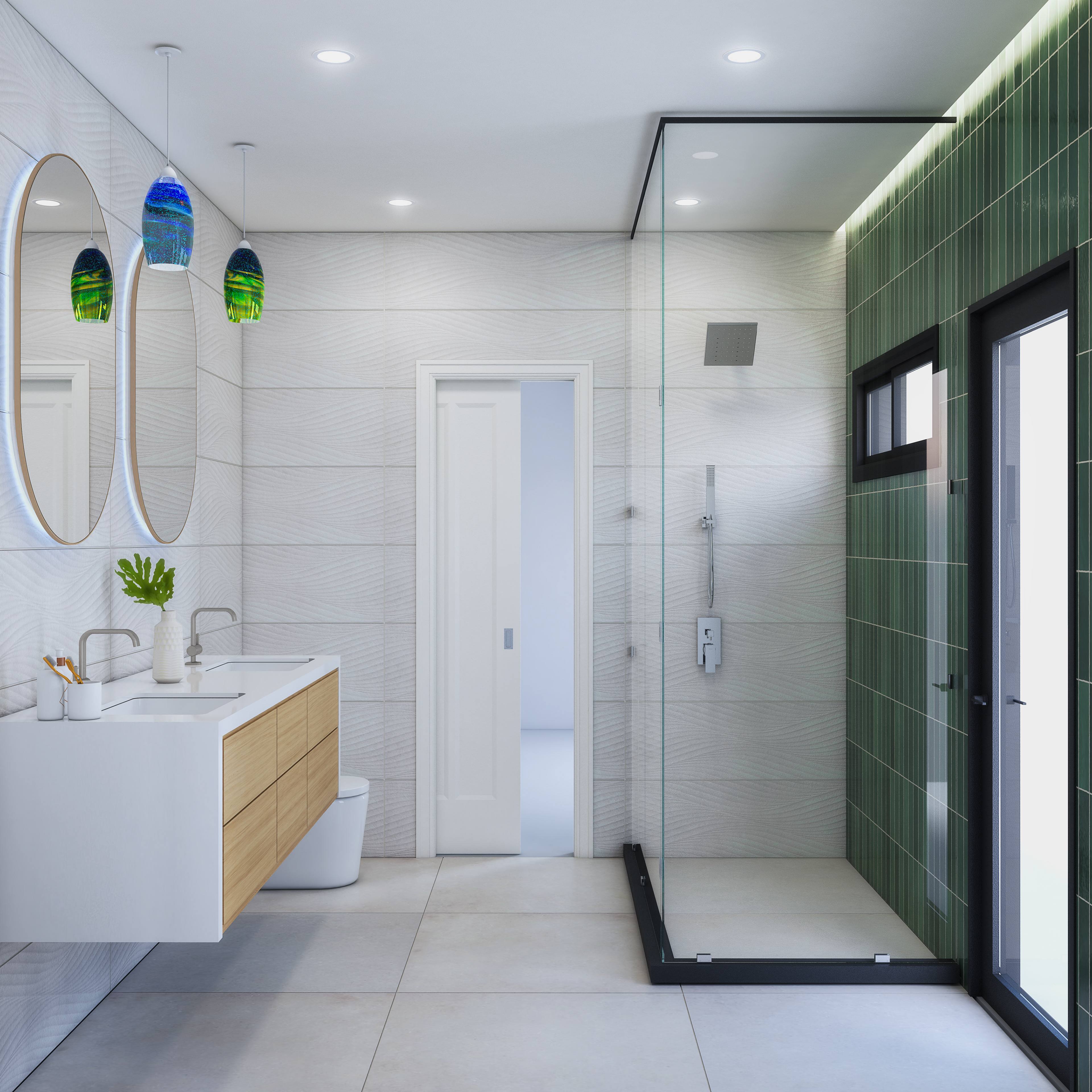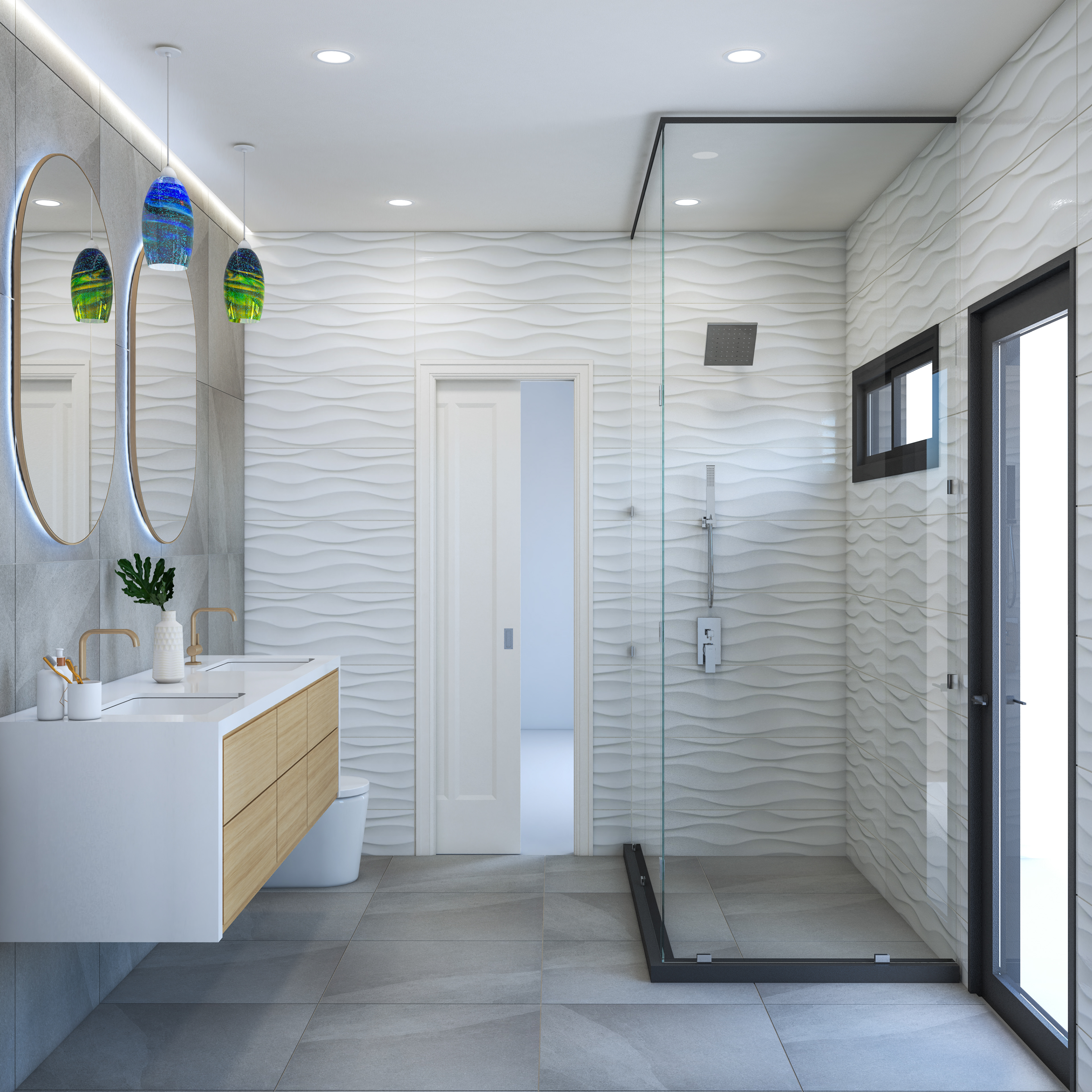In this project, we worked on bathroom concept designs for our customer's children. They requested a spacious bathroom suitable for their use both now and in their youth. They gave us some material selection preferences and existing lamps to integrate into the design. There were lots of material combination ideas. We analyzed the use of different colors and their effects on comfort and enjoyment.