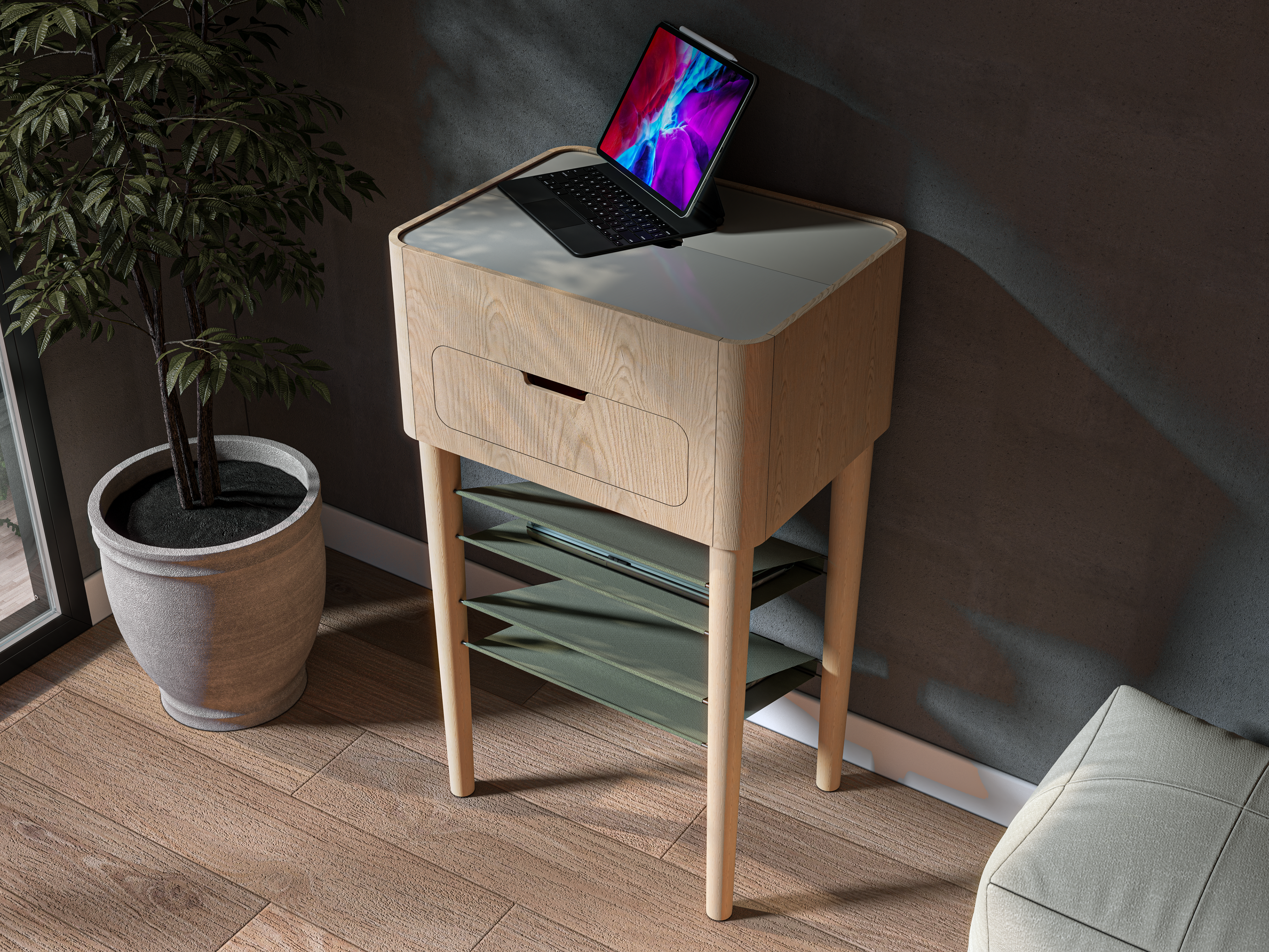 The storage unit has one drawer, one top-opening area and two laptop cloth shelves. Our goal is to hide all the crowd and create useful spaces. At the same time, it also supports charging thanks to the socket and usb port on the upper unit. In terms of materials, we paid attention to natural tones and their harmony with our current home